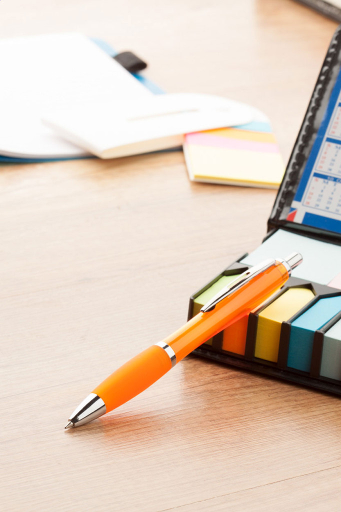 Műanyag golyóstoll áttetsző testtel, színben megegyező markolattal és fényes króm alkatrészekkel. Kék tollbetéttel szállítjuk.