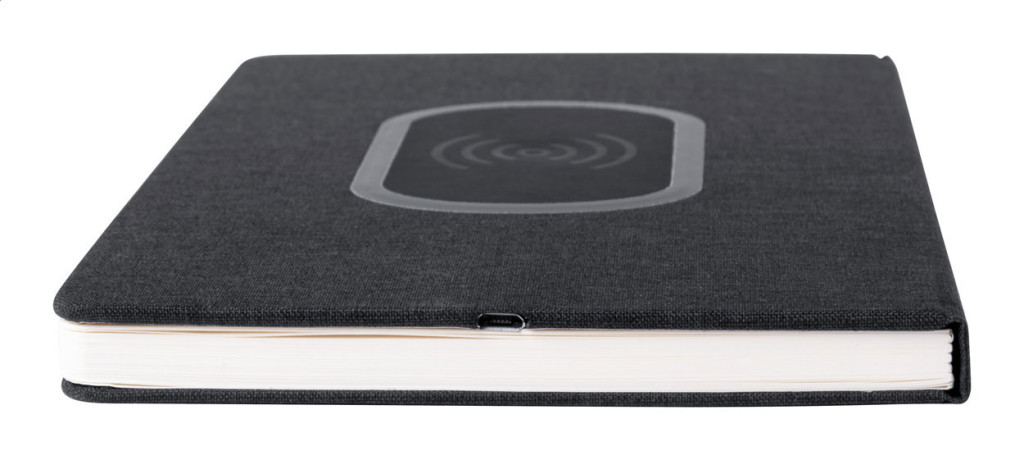 300D poliészter borítású, A5 méretű jegyzetfüzet beépített vezeték nélküli töltővel (5W) és 80 vonalas lappal. USB töltőkábellel szállítjuk.