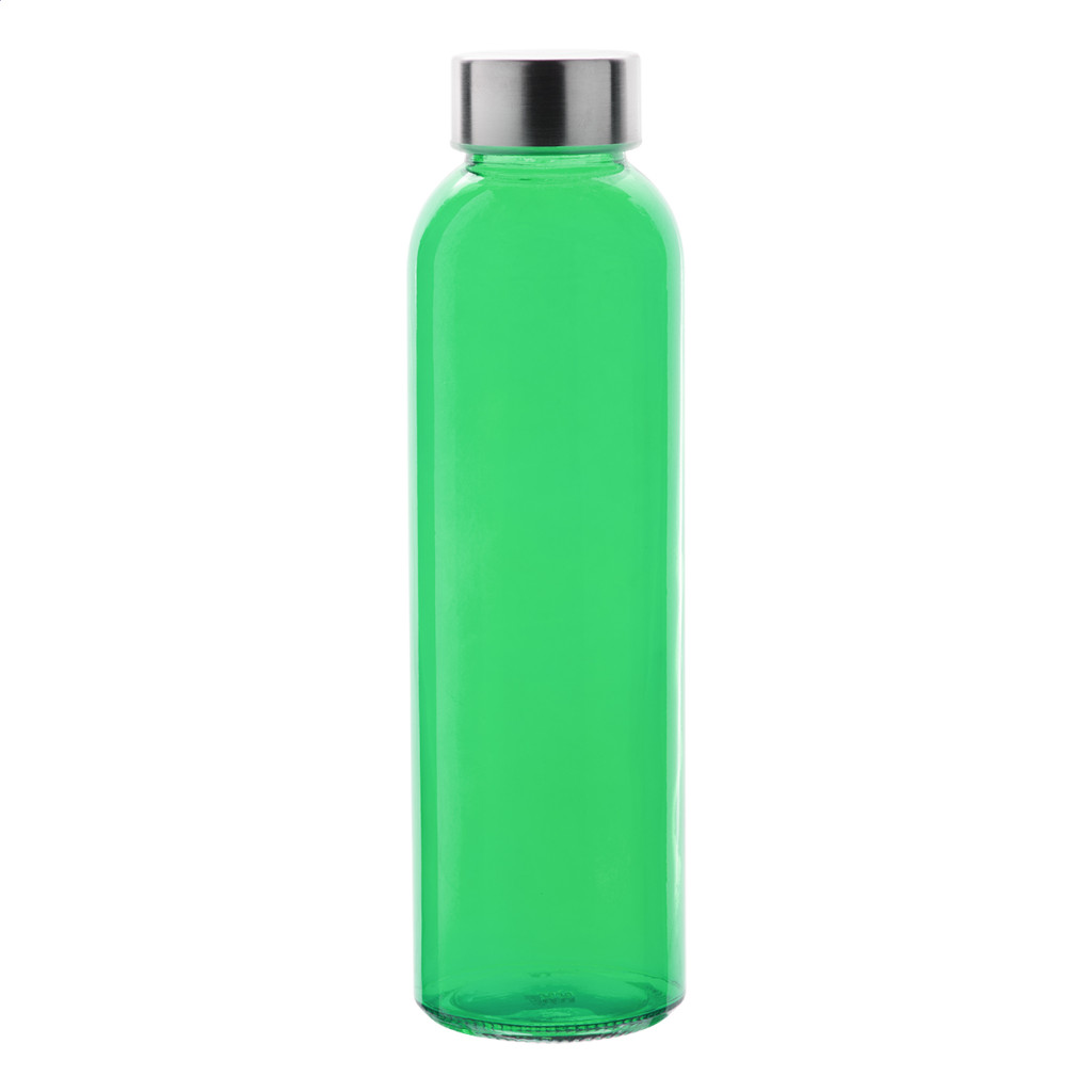 Átlátszó üveg kulacs rozsdamentes acél kupakkal, 500 ml. Ajándékdobozzal szállítjuk. Nem alkalmas szénsavas italok tárolására.