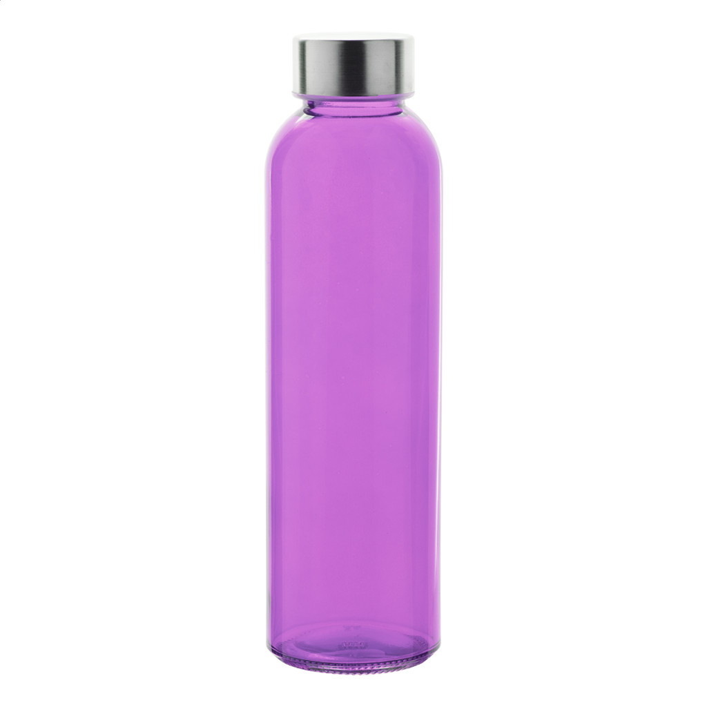 Átlátszó üveg kulacs rozsdamentes acél kupakkal, 500 ml. Ajándékdobozzal szállítjuk. Nem alkalmas szénsavas italok tárolására.