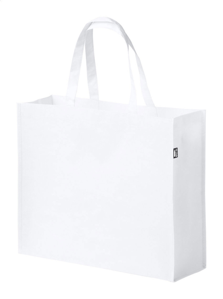 Laminált RPET bevásárlótáska közepes hordfüllel és betoldással, RPET poliészter 105 g/m². Megkülönböztető RPET címkével.