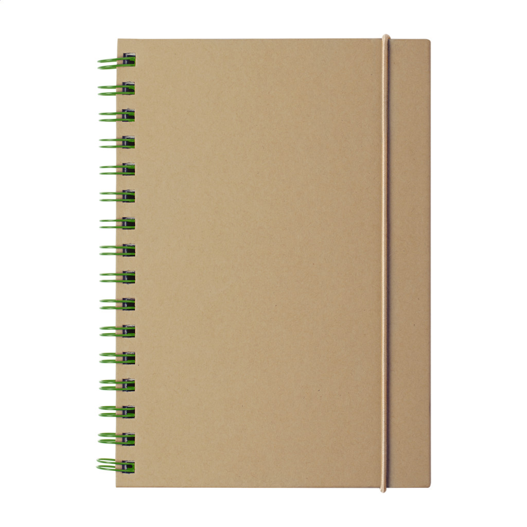 Újrahasznosított karton borítású jegyzetfüzet 80 db vonalas A5 méretű lappal és gumi szíjjal.