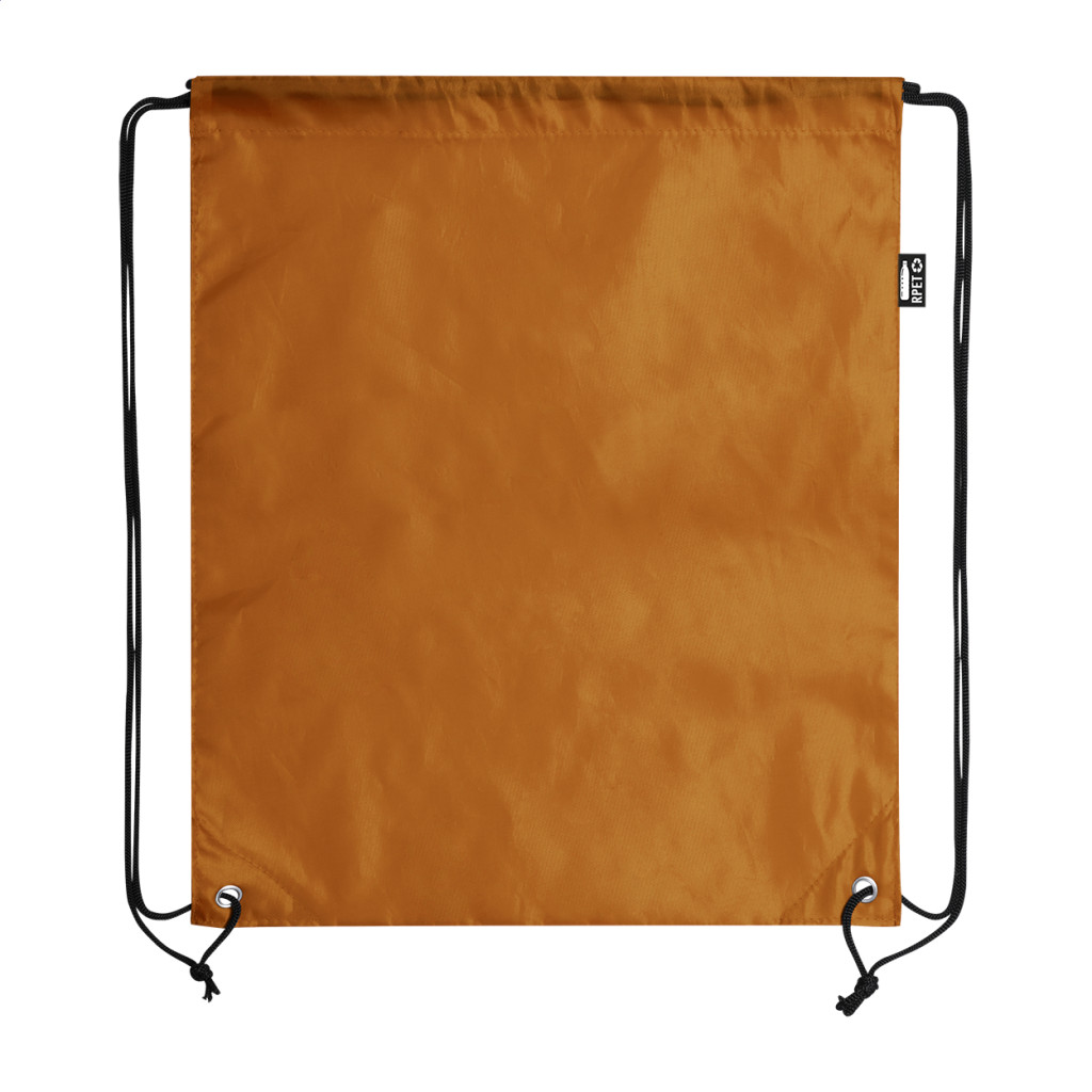 RPET poliészter hátizsák megerősített sarkakkal. Megkülönböztető RPET címkével.
