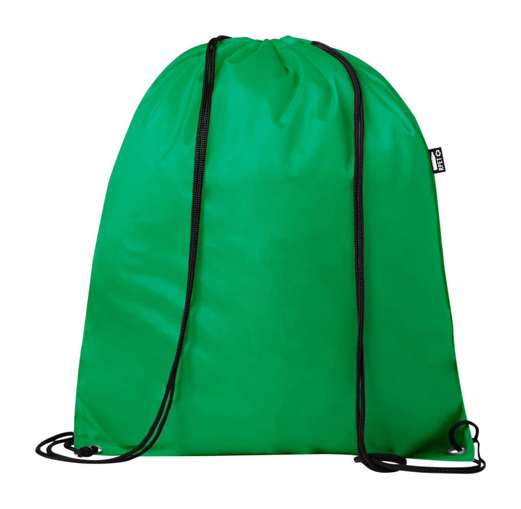 RPET poliészter hátizsák megerősített sarkakkal. Megkülönböztető RPET címkével.