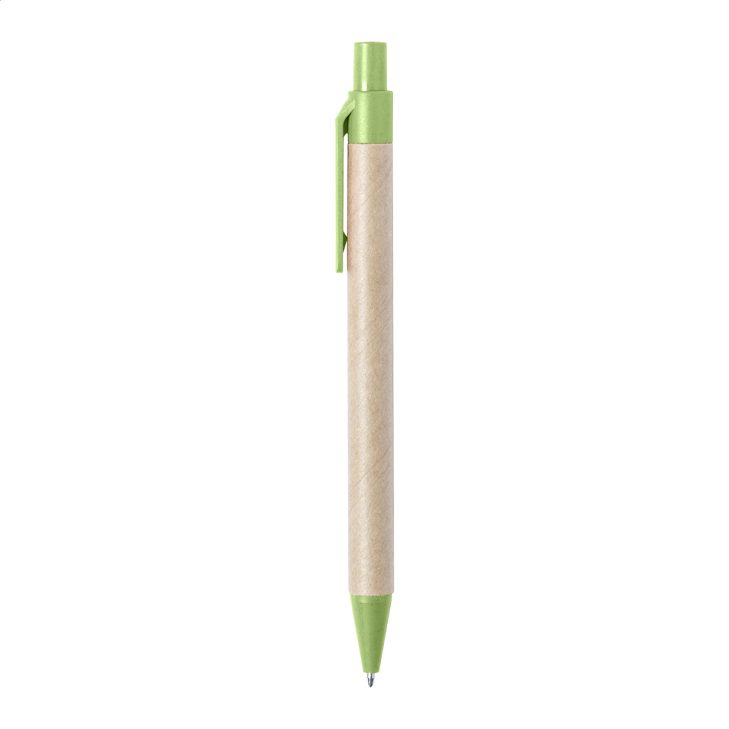 Újrahasznosított papírból készült golyóstoll környezetbarát búzaszalma műanyag részekkel. Kék tollbetéttel szállítjuk.