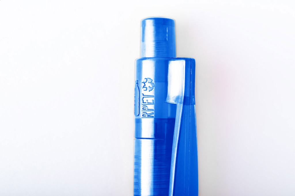Áttetsző, RPET műanyag golyóstoll. Kék tollbetéttel szállítjuk.