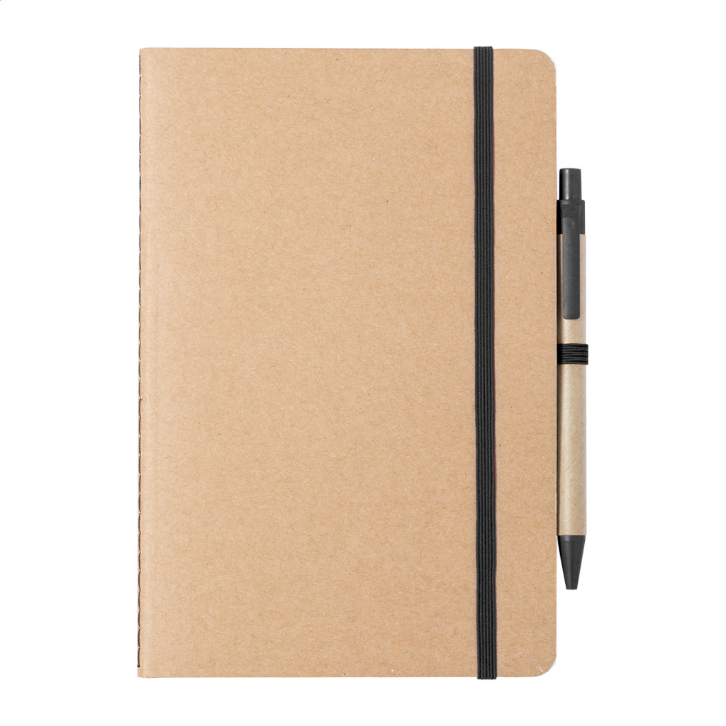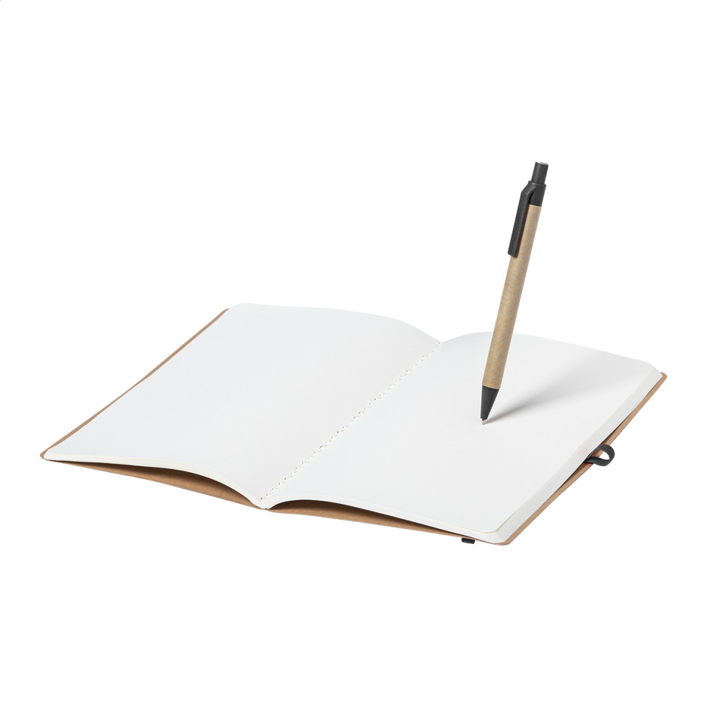 Újrahasznosított karton borítású jegyzetfüzet 60 sima lappal és színes gumipánttal, A5 méretű. Búzaszalma műanyag golyóstollal, kék tollbetéttel.