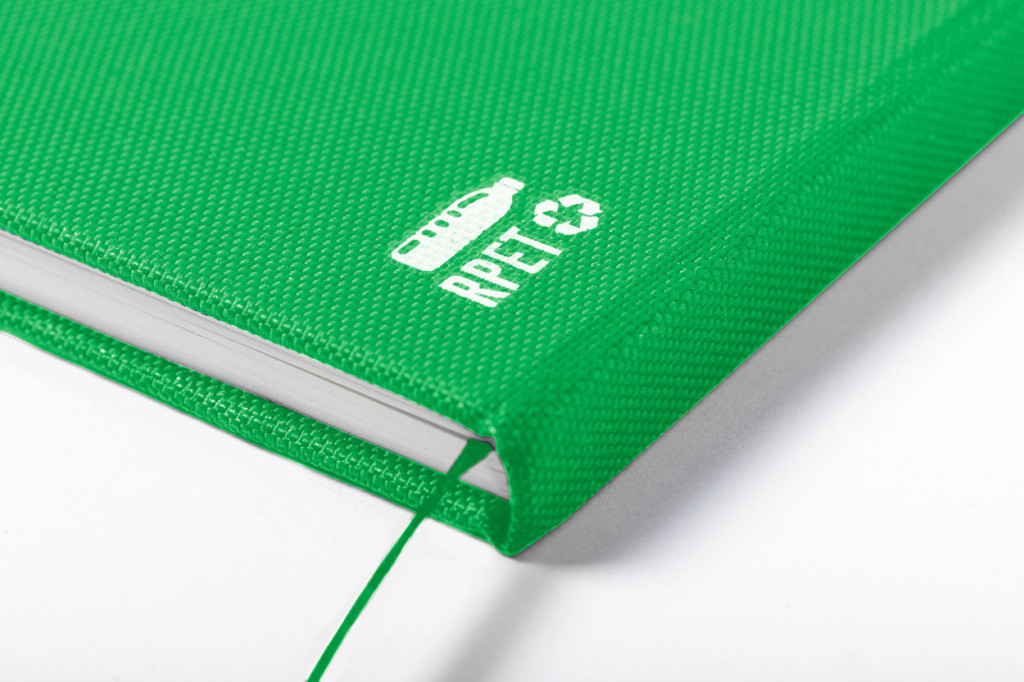 RPET poliészter borítású jegyzetfüzet 80 vonalas lappal, könyvjelzővel és gumipánttal. Méret: A5.