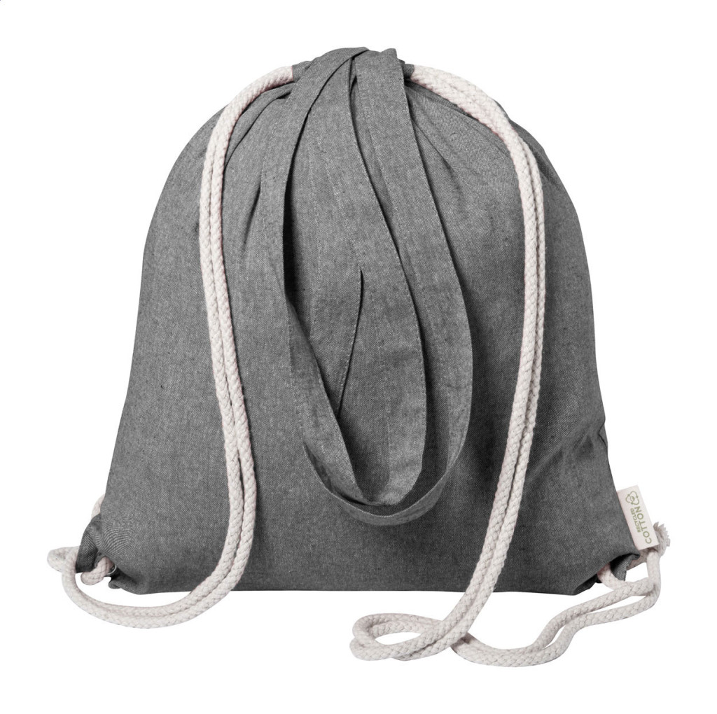 Pamut táska újrahasznosított pamutból, vastag fonott zsinórral és hosszú hordfüllel. Bevásárlótáskaként is használható. 100% újrahasznosított pamut, 140 g/m².