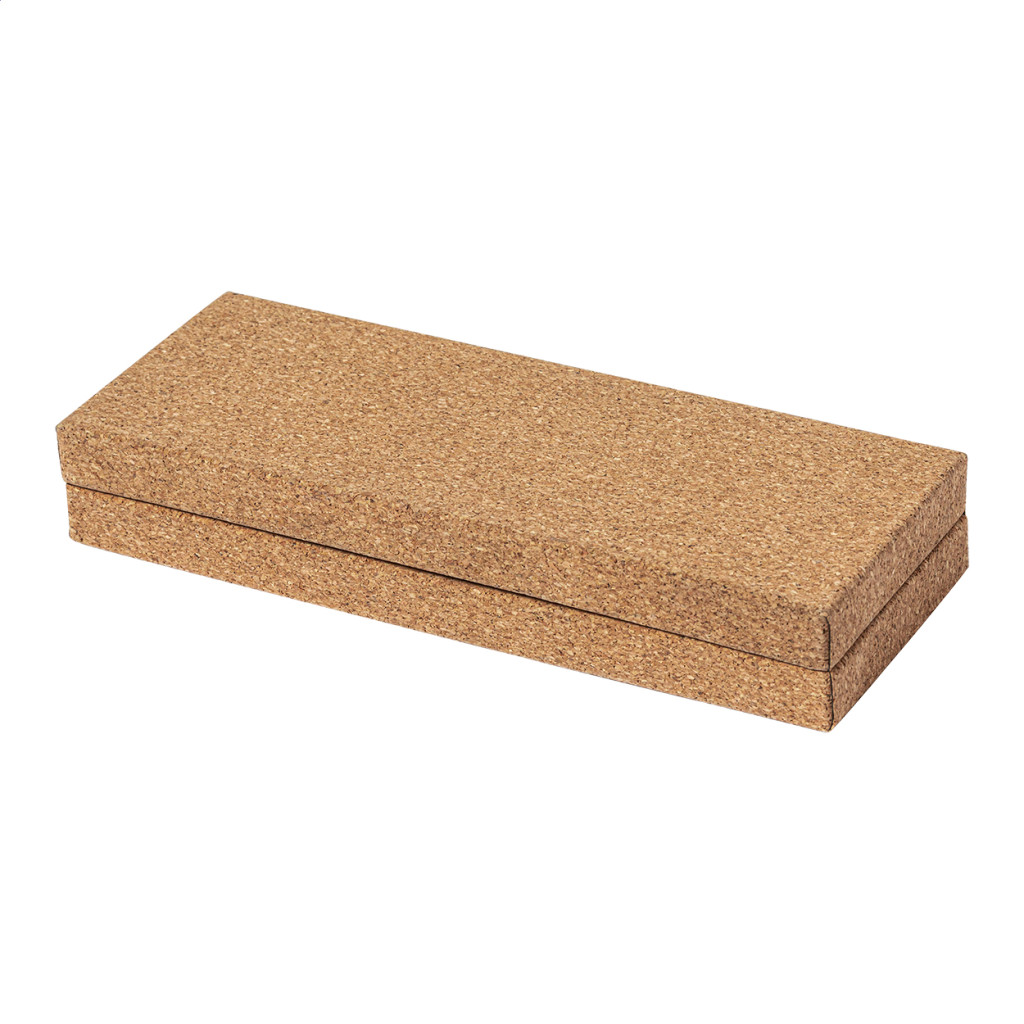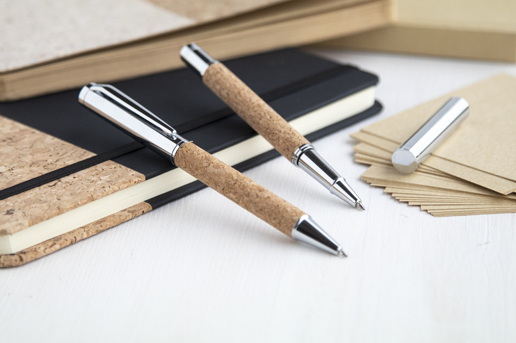 Elegáns, fém golyóstoll és rollertoll szett természetes parafa borítással. Parafa dobozban, kék tollbetéttel szállítjuk.