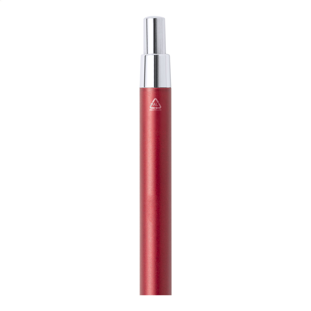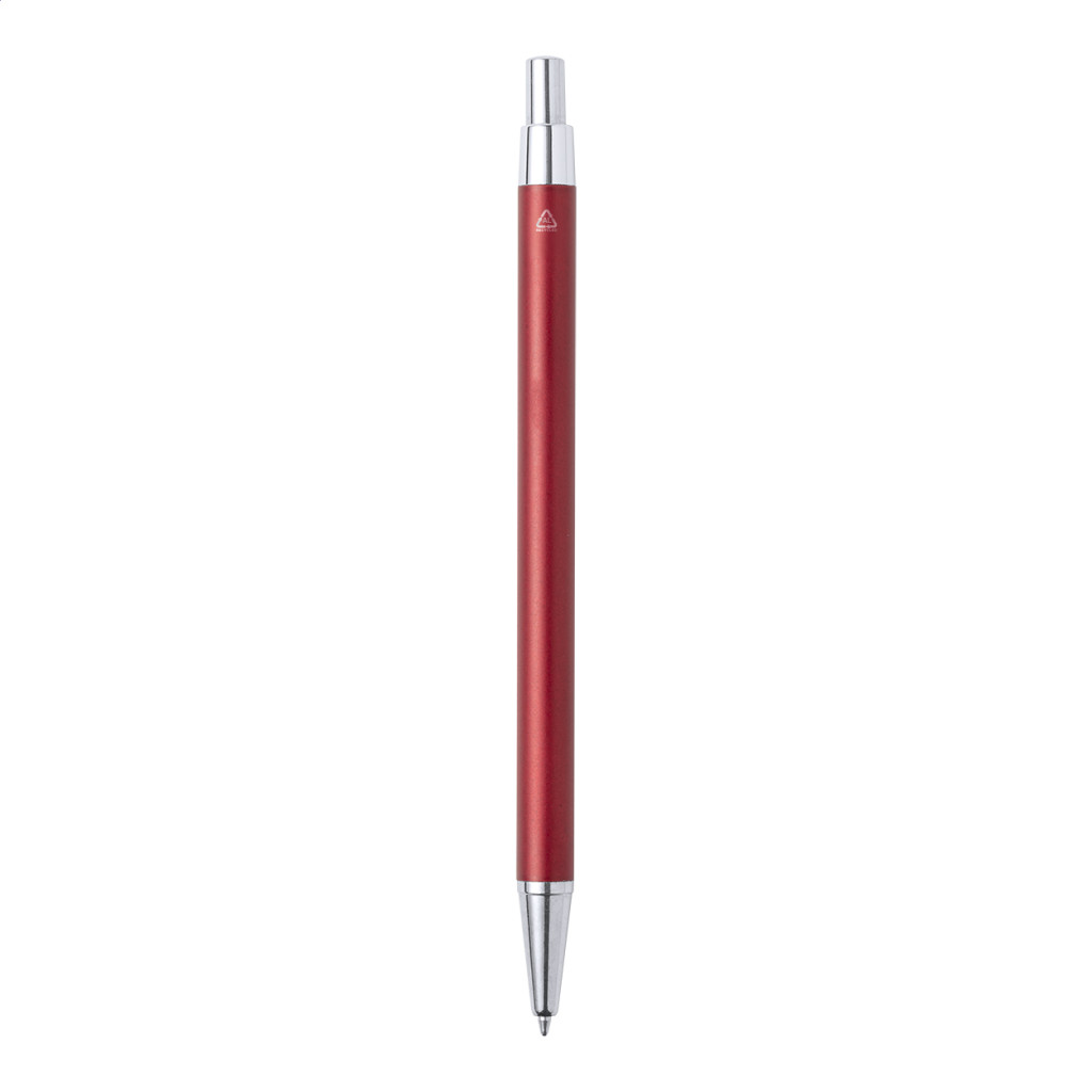 Újrahasznosított alumínium golyóstoll króm részekkel. Kék tollbetéttel szállítjuk.