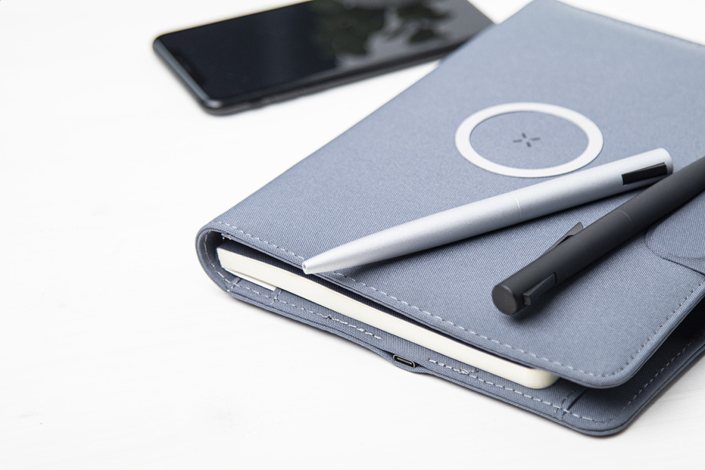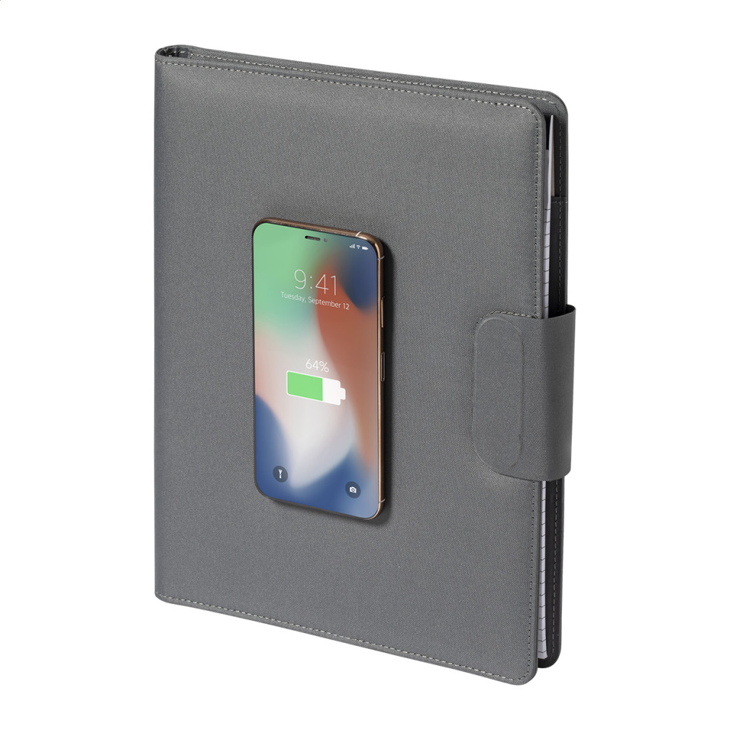 A4 méretű, 300D RPET poliészterből készült iratmappa. Beépített, mágneses vezeték nélküli töltővel (10W), 5000 mAh akkumulátorú power bank-kal és USB bemenettel ellátva. Egy összehajtható mobiltelefon-tartót és 20 vonalas lapot tartalmaz. Öntapadós fémgyűrűvel, ami minden vezeték nélküli töltővel ellátott eszközzel használható. USB töltőkábellel szállítjuk.