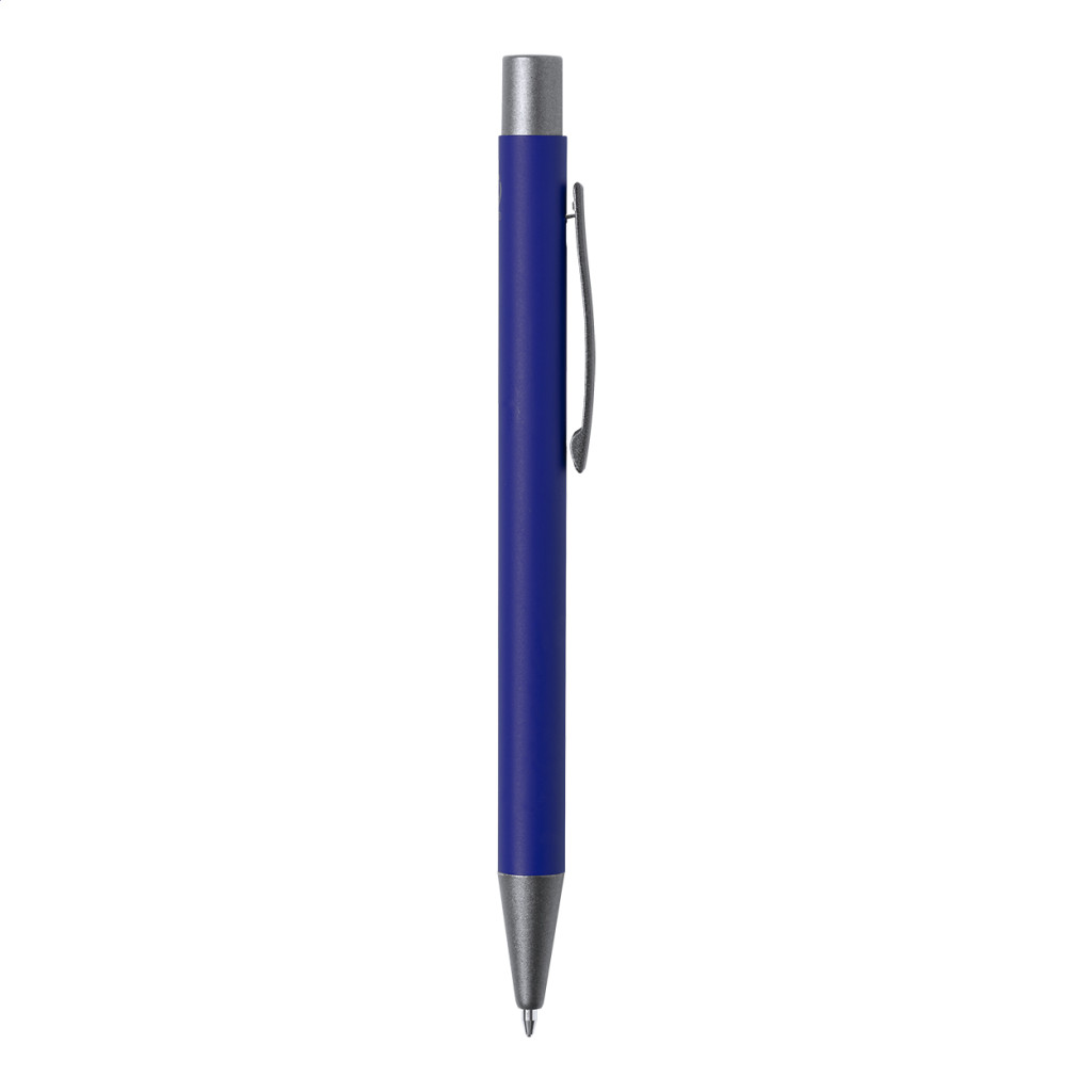 Újrahasznosított alumínium golyóstoll fémes felületű részekkel. Kék tollbetéttel szállítjuk.