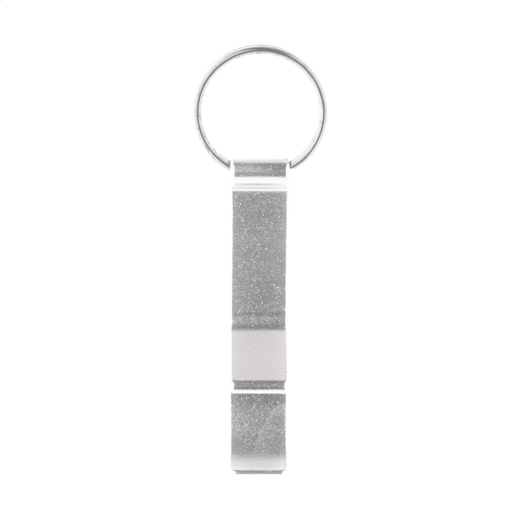 Újrahasznosított alumínium kulcstartó, üveg- és konzervnyitó funkcióval, fém karikával.
