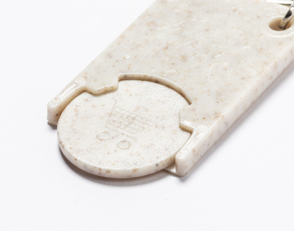 Ökológiai búzaszalmából és ABS műanyagból készült bevásárlókocsi érme, fém kulcstartóval.