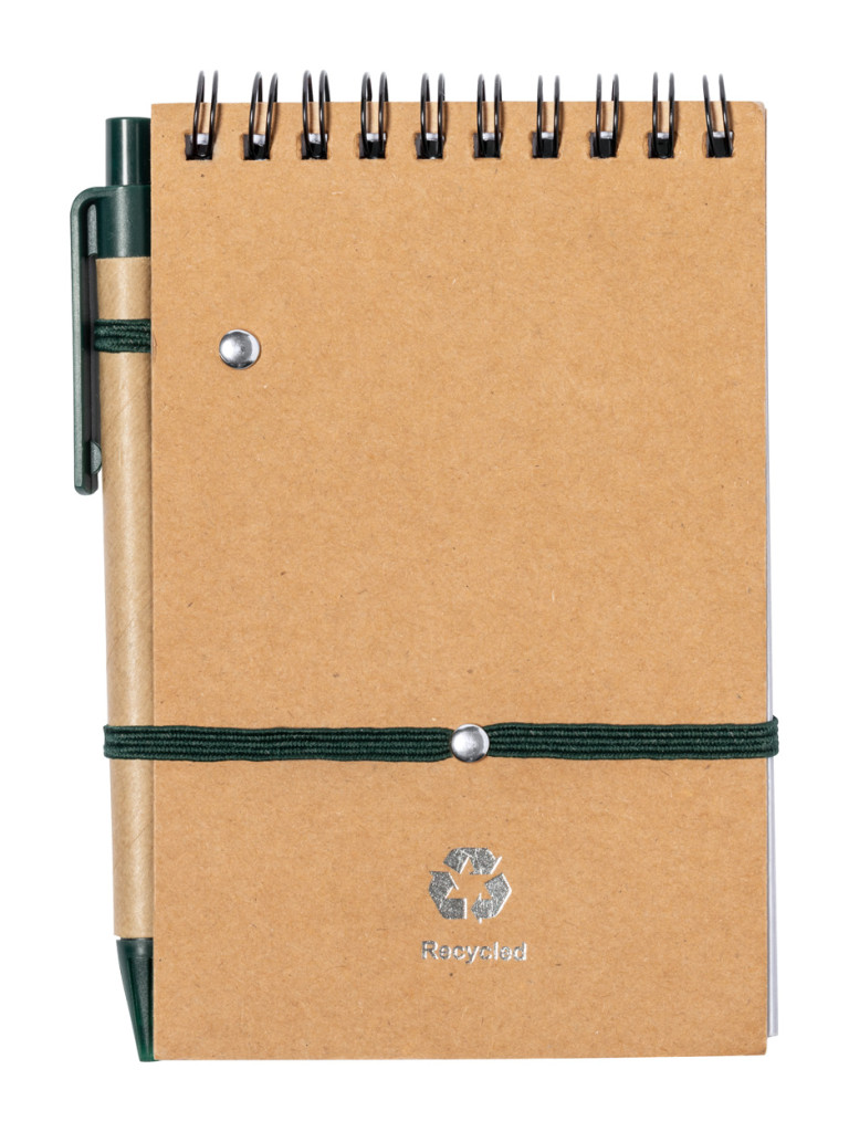 Újrahasznosított papírból készült spirál jegyzetfüzet 70 vonalas lappal, újrahasznosított karton golyóstollal. Kék tollbetéttel szállítjuk. A6 méretű.