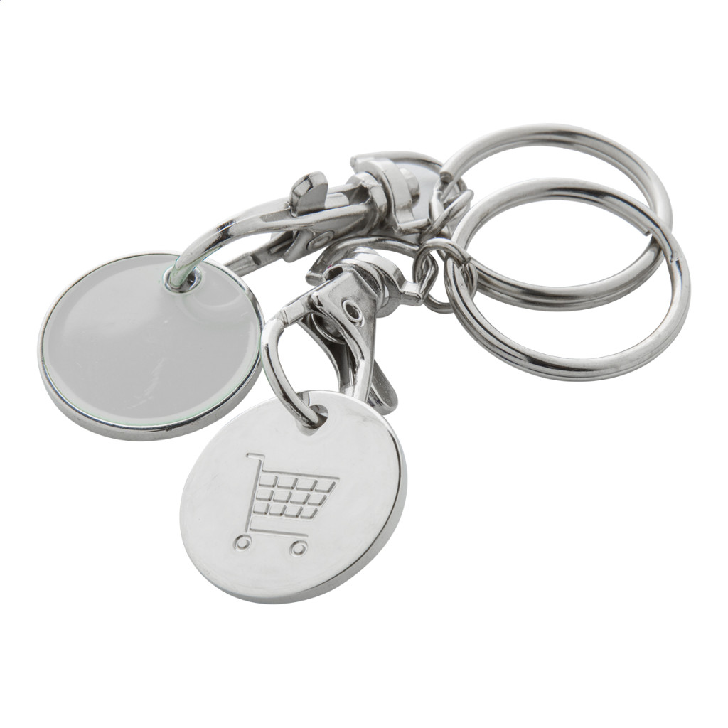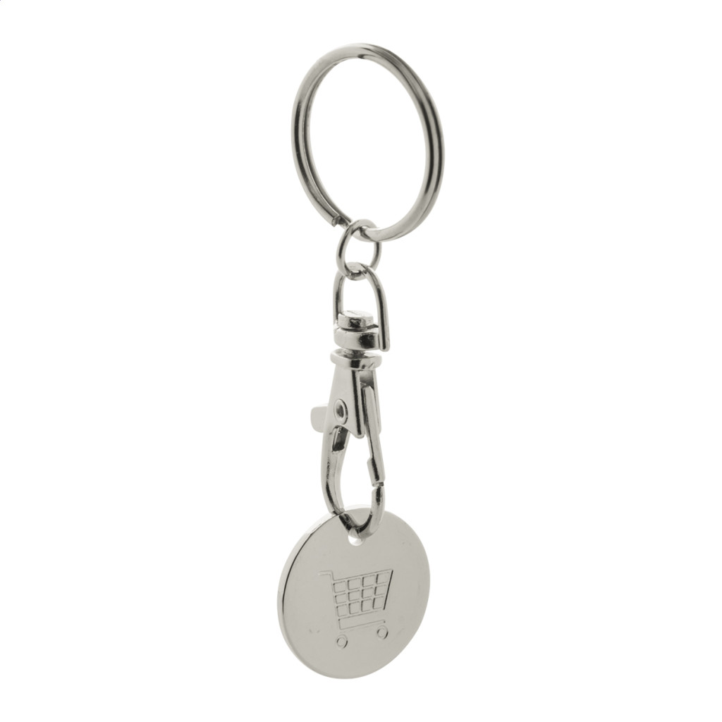 Fém bevásárlókocsi érme karabinerrel és kulcskarikával, melynek egyik oldala színes, másik oldalán pedig bevásárlókocsi logó található. Érme mérete: ø23×1,7 mm.