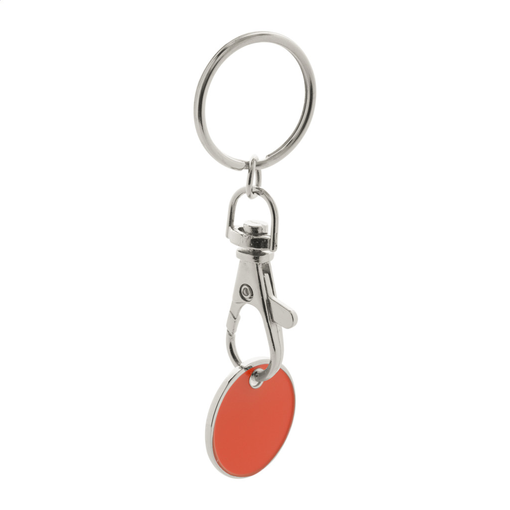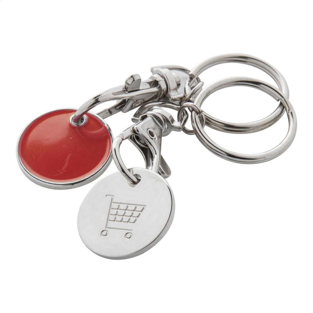 Fém bevásárlókocsi érme karabinerrel és kulcskarikával, melynek egyik oldala színes, másik oldalán pedig bevásárlókocsi logó található. Érme mérete: ø23×1,7 mm.