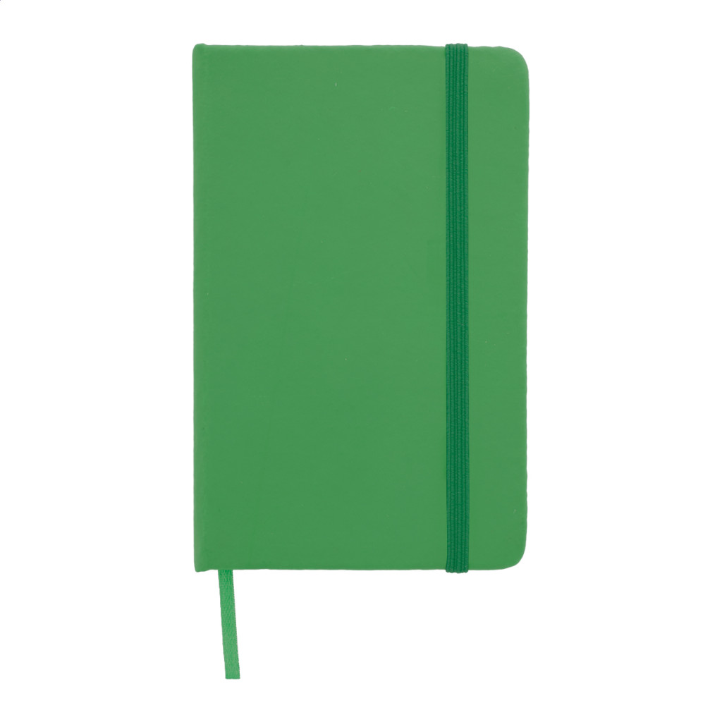 PU bőr borítású jegyzetfüzet 100 sima lappal, könyvjelzővel, gumipánttal zárható. A6 méretű.
