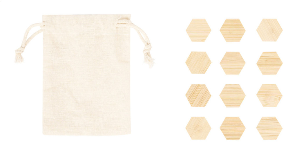 12 db-os bambusz hűtőmágnes készlet, pamut zsinóros tasakban.