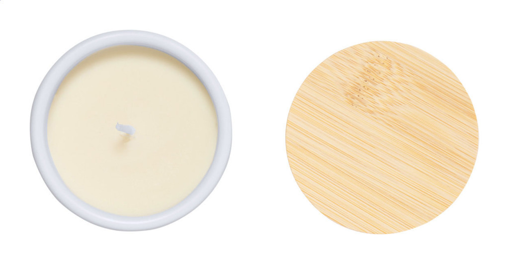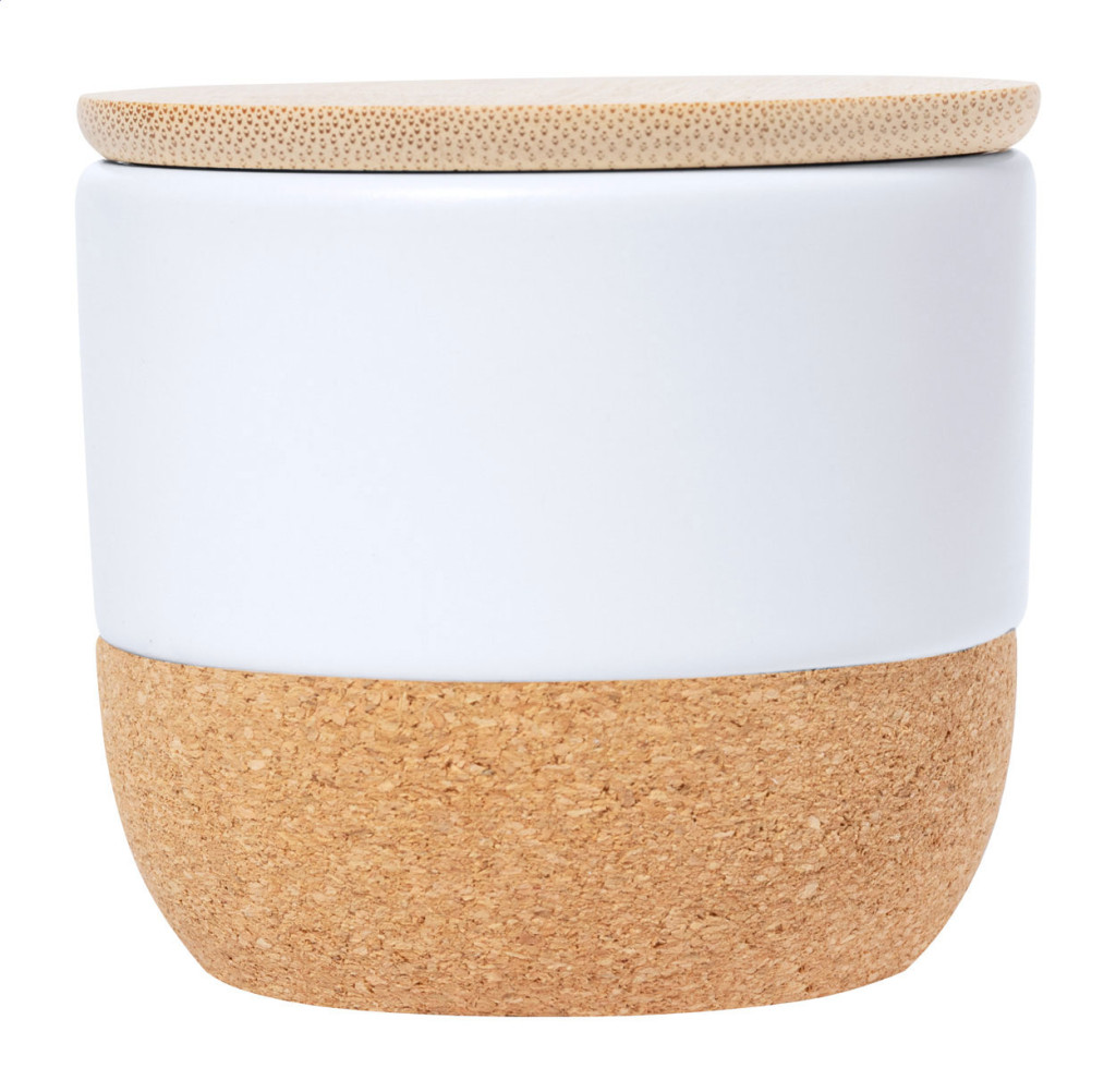 Vanília illatú, növényi alapú viaszgyertya kerámia tartóban, természetes parafa talppal és bambusz tetővel.