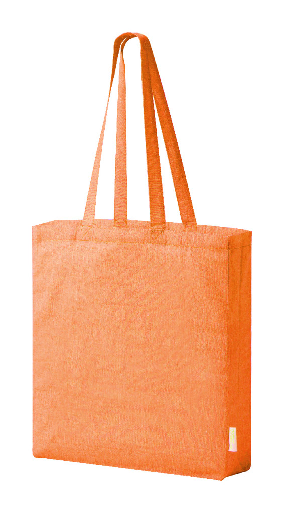 Újrahasznosított pamut bevásárlótáska, hosszú hordfüllel, betoldással és megkülönböztető újrahasznosított pamut címkével. 100% újrahasznosított pamut, 140 g/m².
