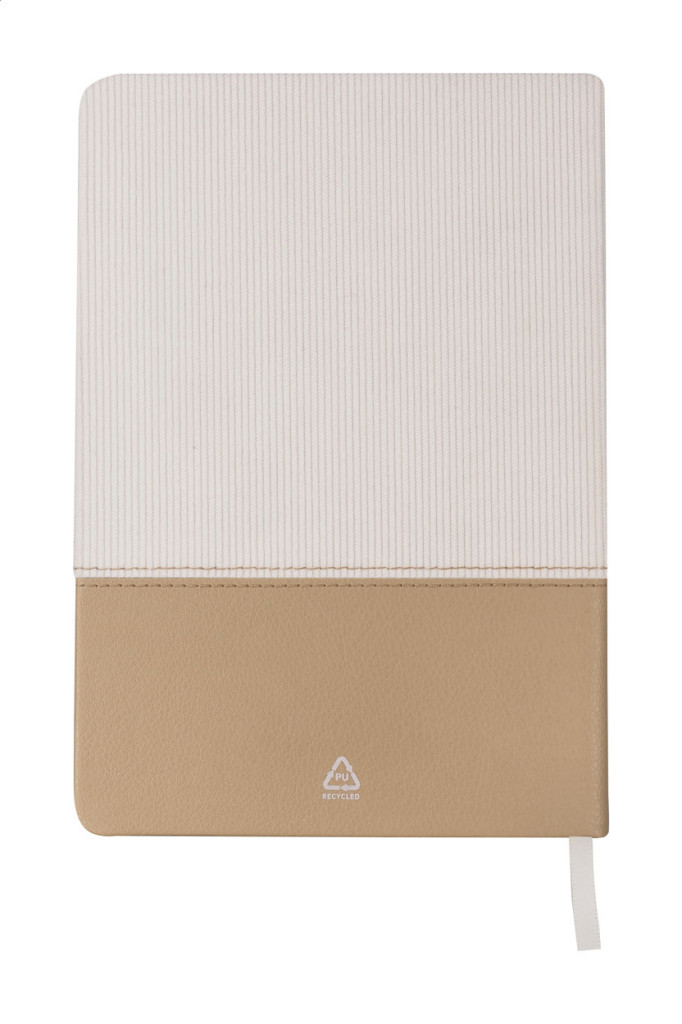 Texturált poliészter és újrahasznosított PU bőr borítású jegyzetfüzet könyvjelzővel és 80 vonalas lappal. A5 méretű.