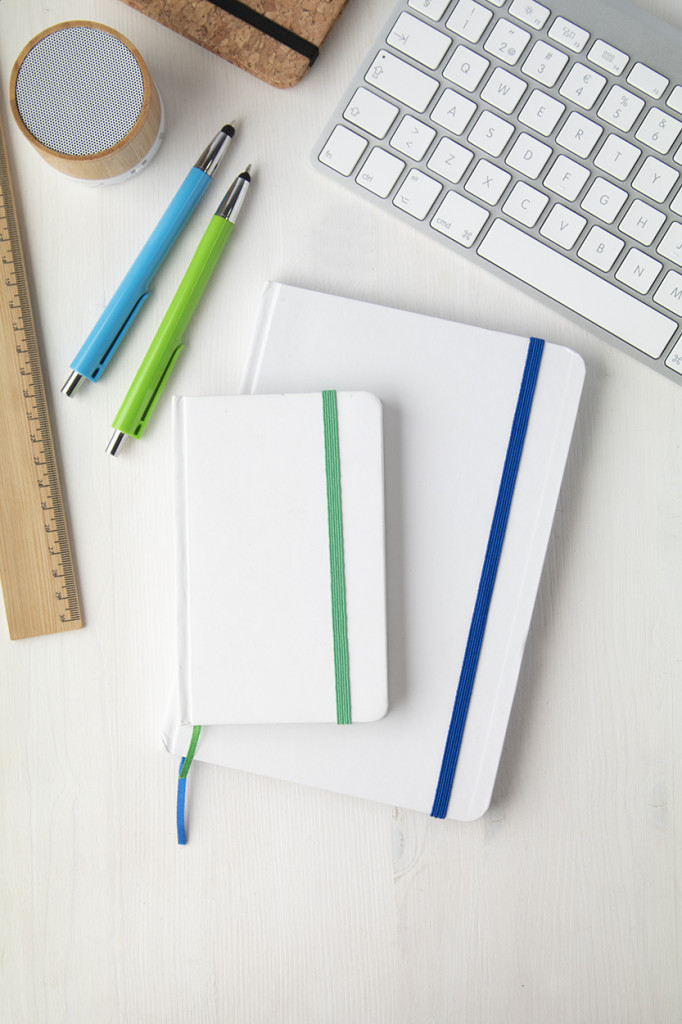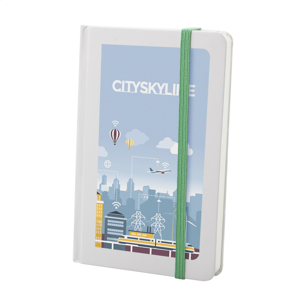Fehér kartonpapír borítású jegyzetfüzet 80 sima lappal, színes gumipánttal zárható. A6 méretű.