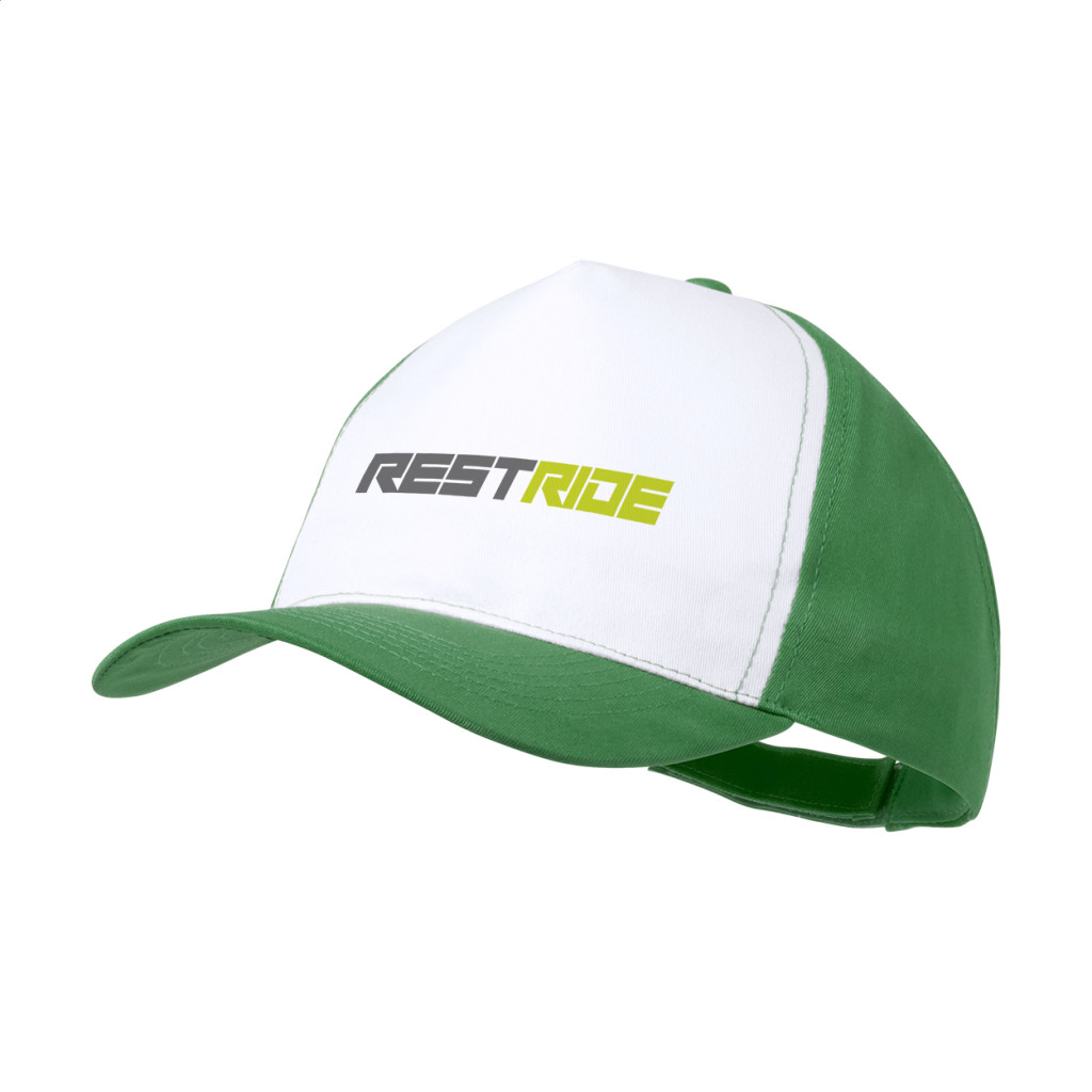 100% poliészter anyagú, 5 paneles baseball sapka, mely szublimációs eljárással jól emblémázható.