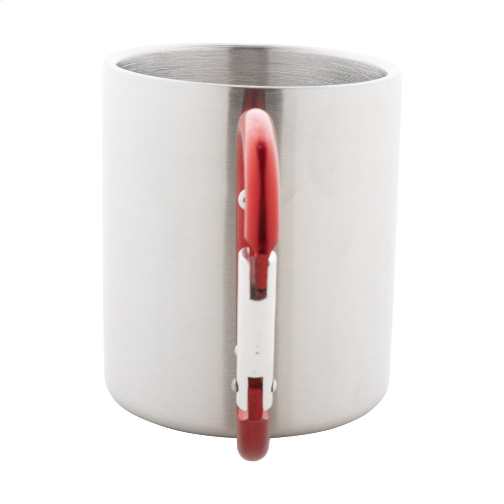 Rozsdamentes acélból készült bögre színes karabinerrel, 200 ml. Dobozban szállítjuk.