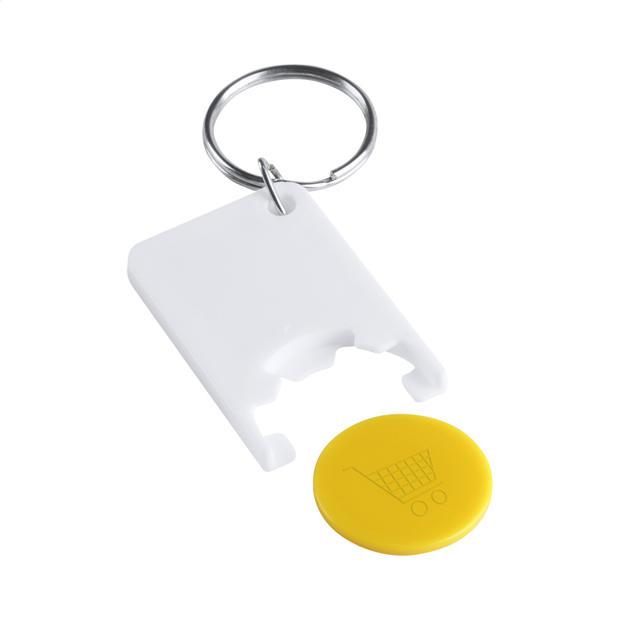 Műanyag bevásárlókocsi érme, fém kulcskarikával.