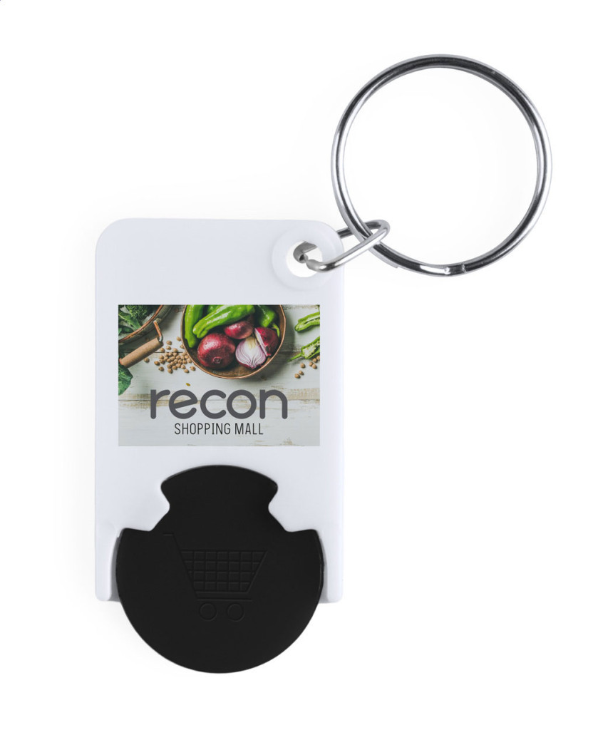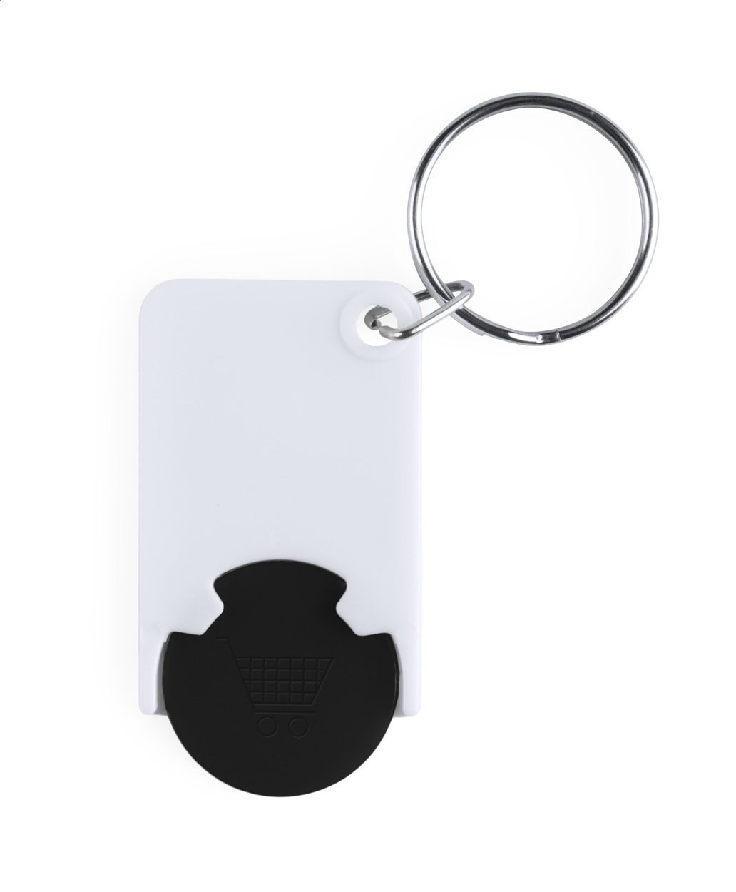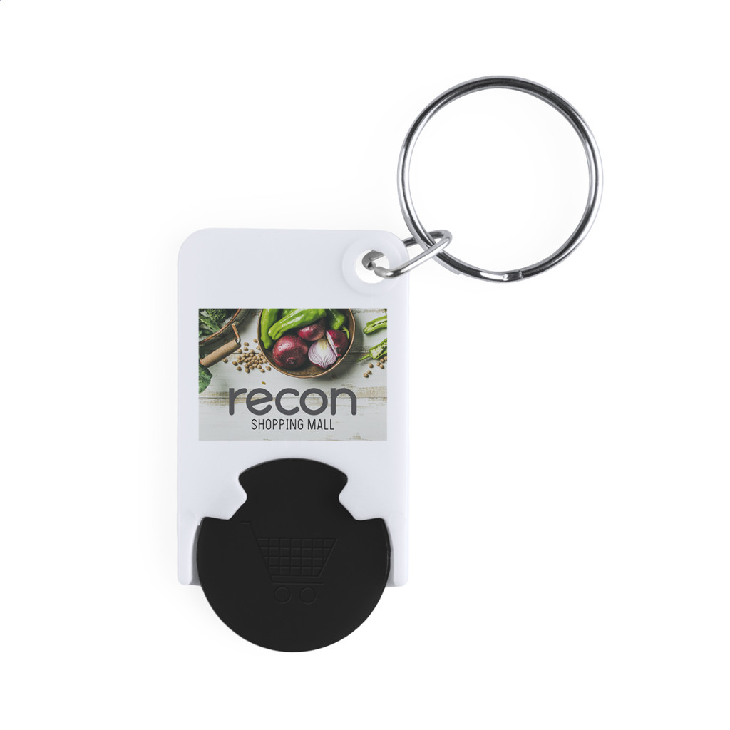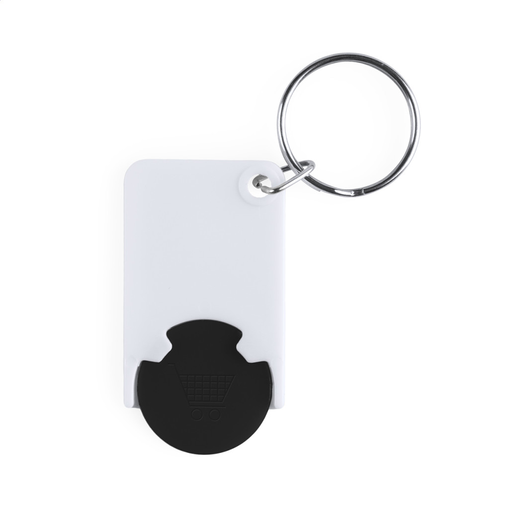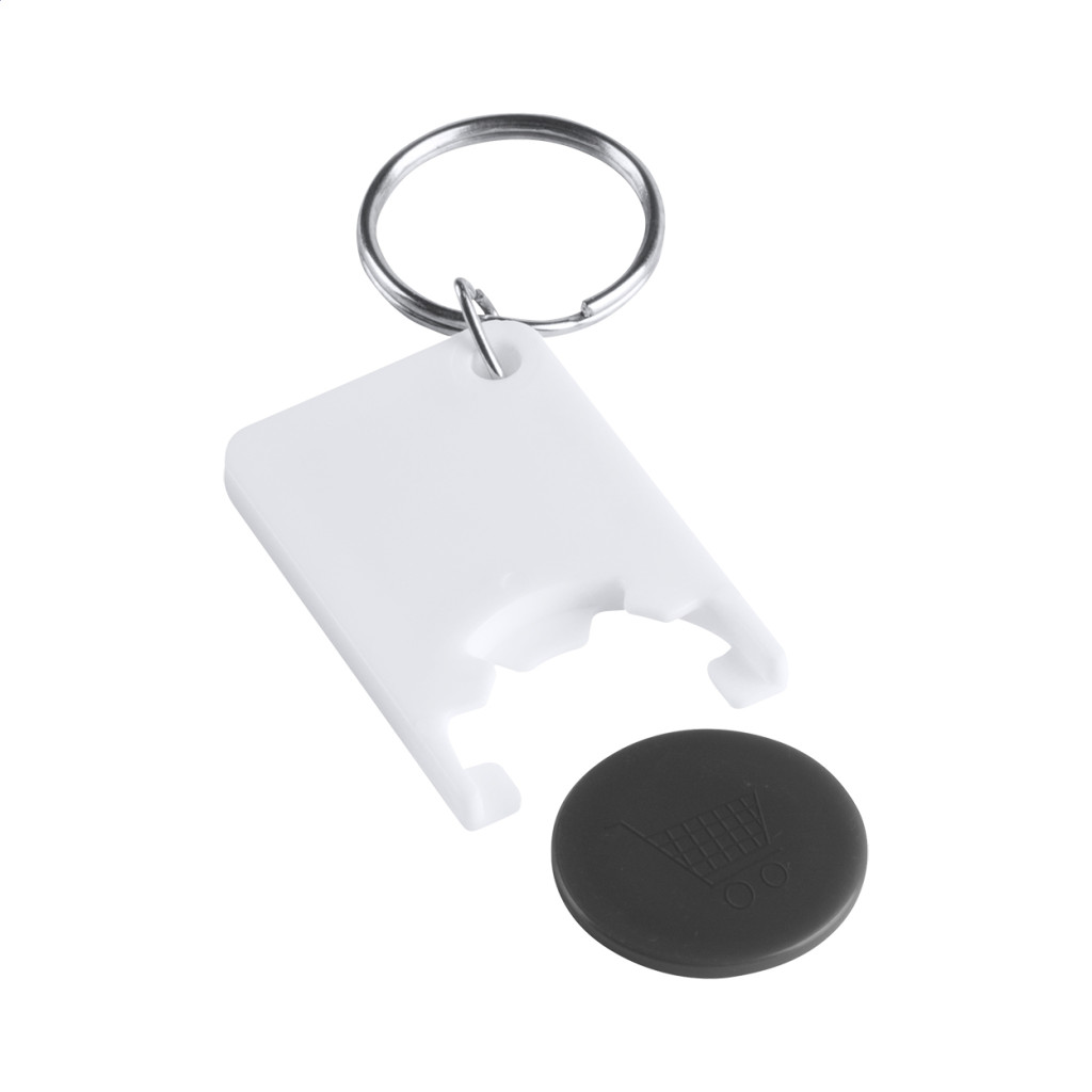 Műanyag bevásárlókocsi érme, fém kulcskarikával.