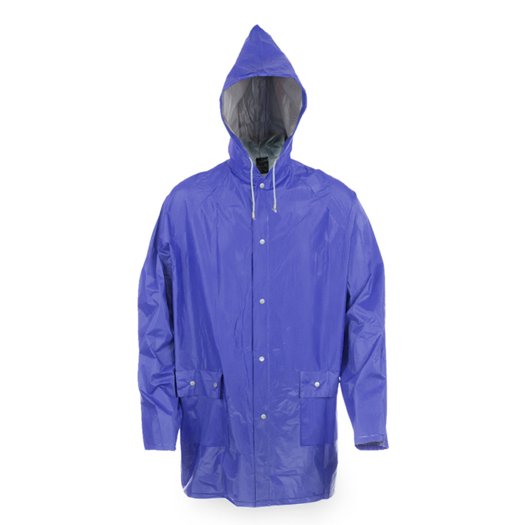 Kapucnis esőkabát ellenálló PVC anyagból, hőtartó bevonattal és két első zsebbel. Patenttal zárható.