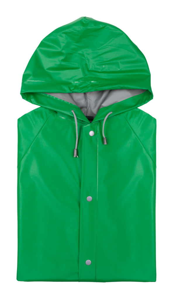 Kapucnis esőkabát ellenálló PVC anyagból, hőtartó bevonattal és két első zsebbel. Patenttal zárható.