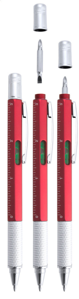 Műanyag golyóstoll fém klipsszel, csillag és laposfejű csavarhúzóval, vízmértékkel és 7 cm-es vonalzóval. Kék tollbetéttel szállítjuk.