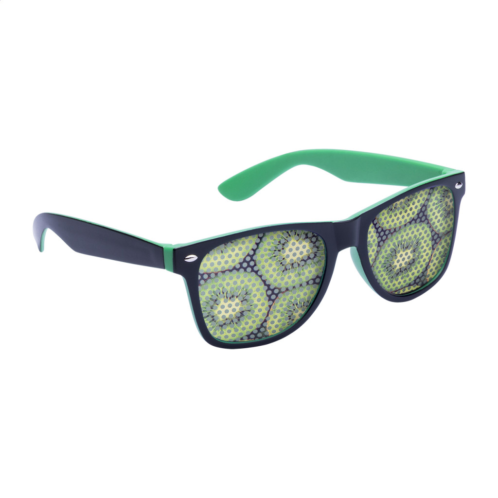 Műanyag napszemüveg kétszínű kerettel, tükrös lencsékkel és UV 400 fényvédelemmel ellátott.