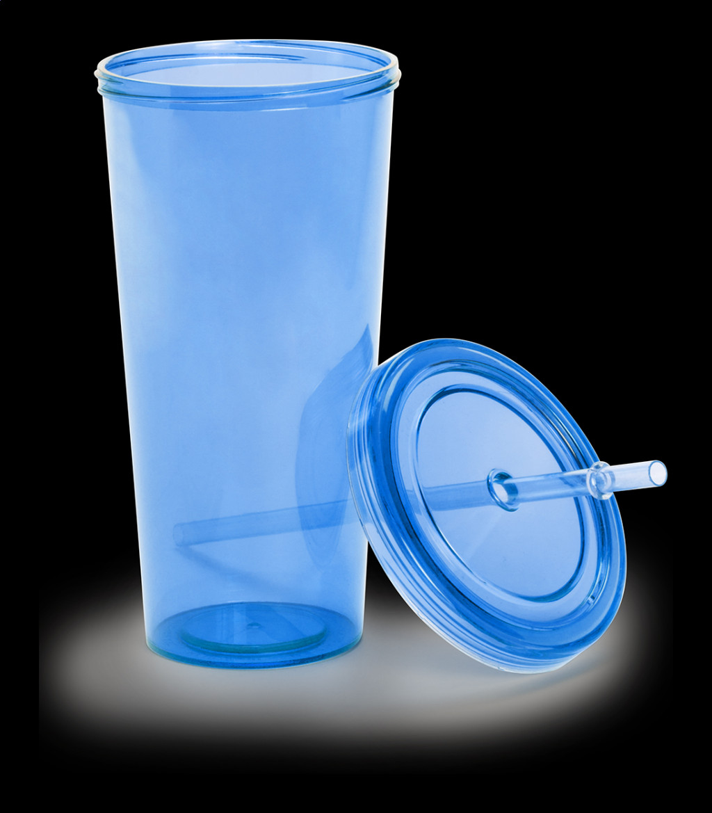 Átlátszó, színes műanyag pohár, megegyező színű fedéllel és szívószállal, 750 ml.