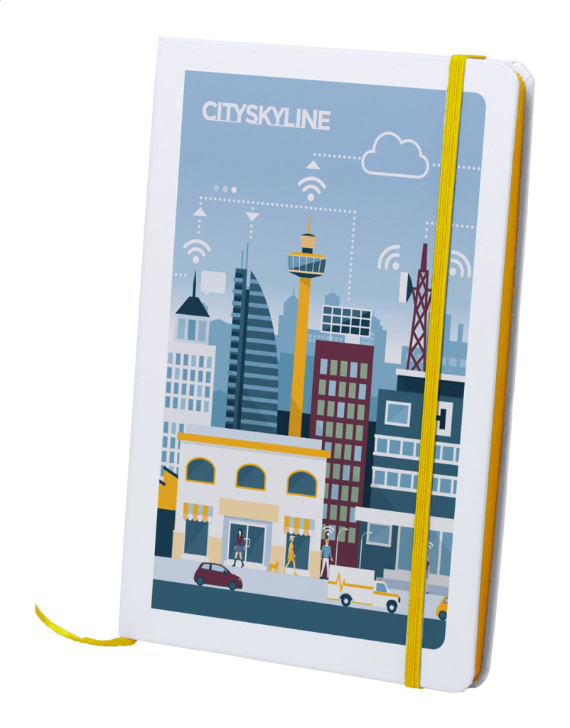 Papír borítású jegyzetfüzet 100 sima lappal, színezett lapélekkel és azonos színű könyvjelzővel és gumipánttal, A5.