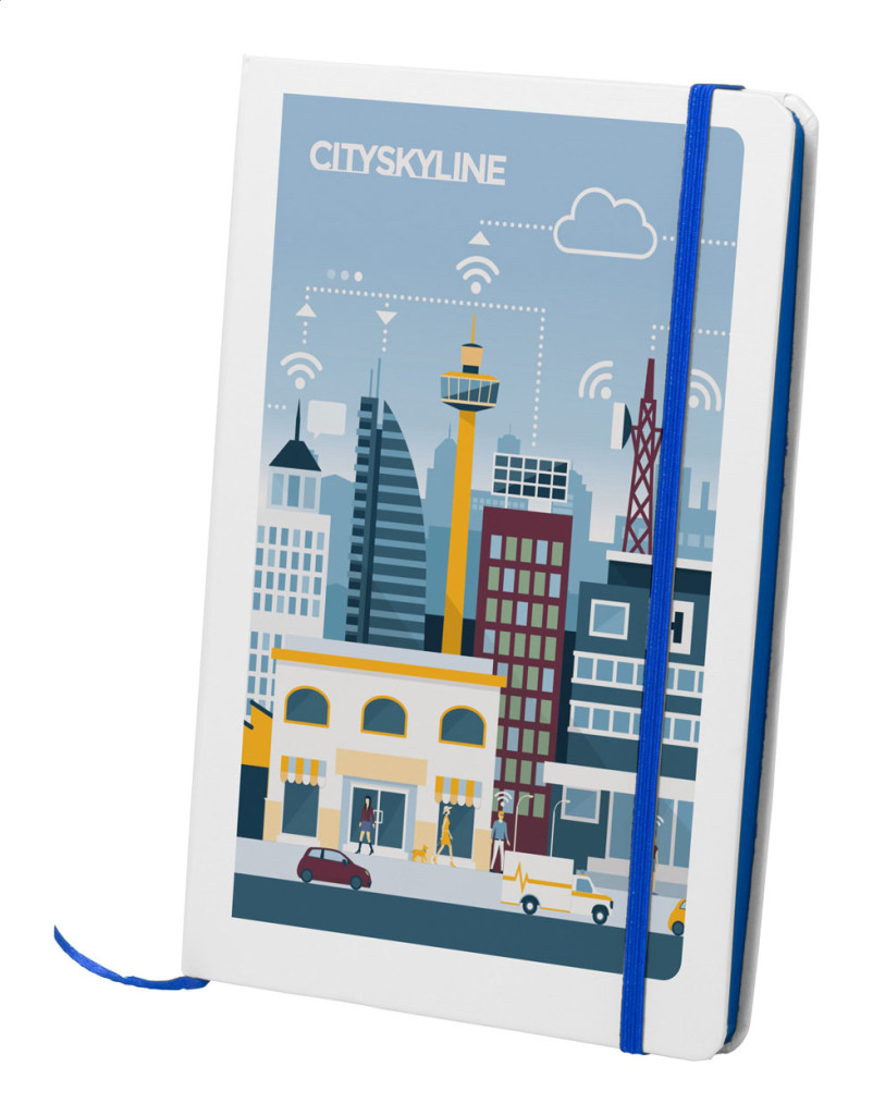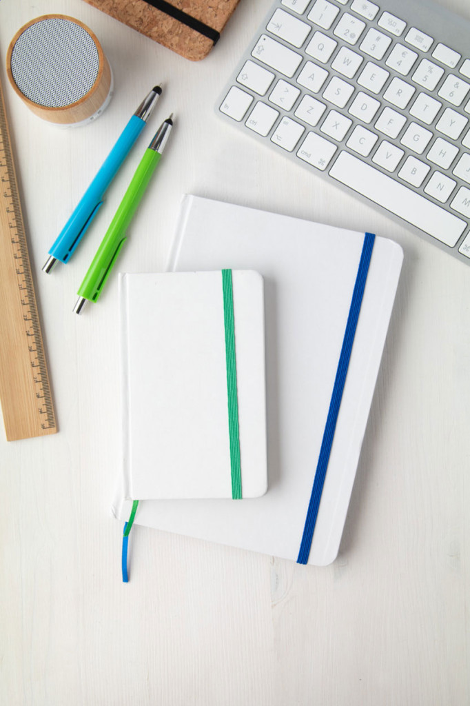 Papír borítású jegyzetfüzet 100 sima lappal, színezett lapélekkel és azonos színű könyvjelzővel és gumipánttal, A5.