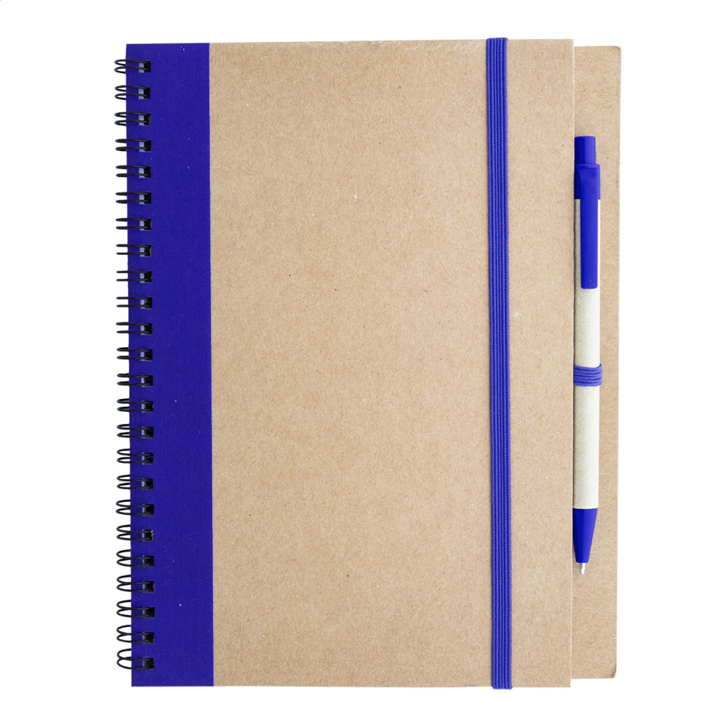 Újrahasznosított papírból készült spirálozott jegyzetfüzet 60 sima lappal, papír golyóstollal.