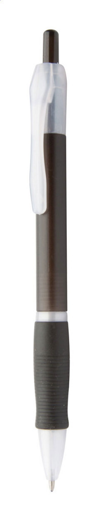 Műanyag golyóstoll gumírozott markolattal, áttetsző fehér klipsszel és tollheggyel. Kék tollbetéttel szállítjuk.
