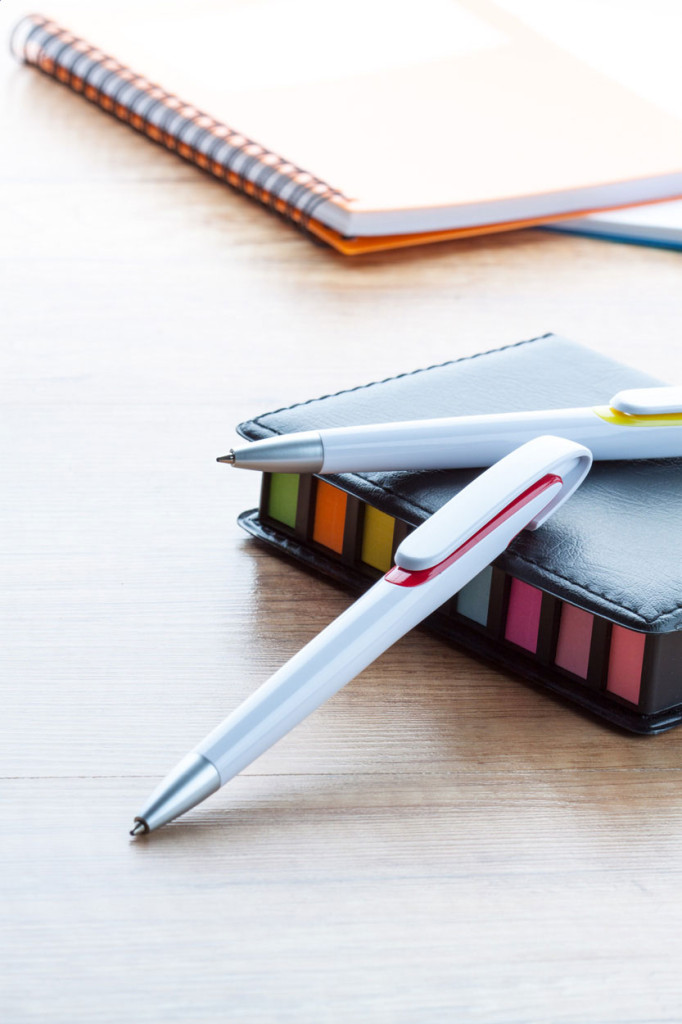 Fehér testű, műanyag golyóstoll, ezüst hatású tollvéggel. A klipsz alatt színes betét található. Kék tollbetéttel szállítjuk.
