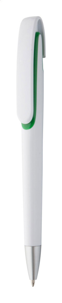 Fehér testű, műanyag golyóstoll, ezüst hatású tollvéggel. A klipsz alatt színes betét található. Kék tollbetéttel szállítjuk.