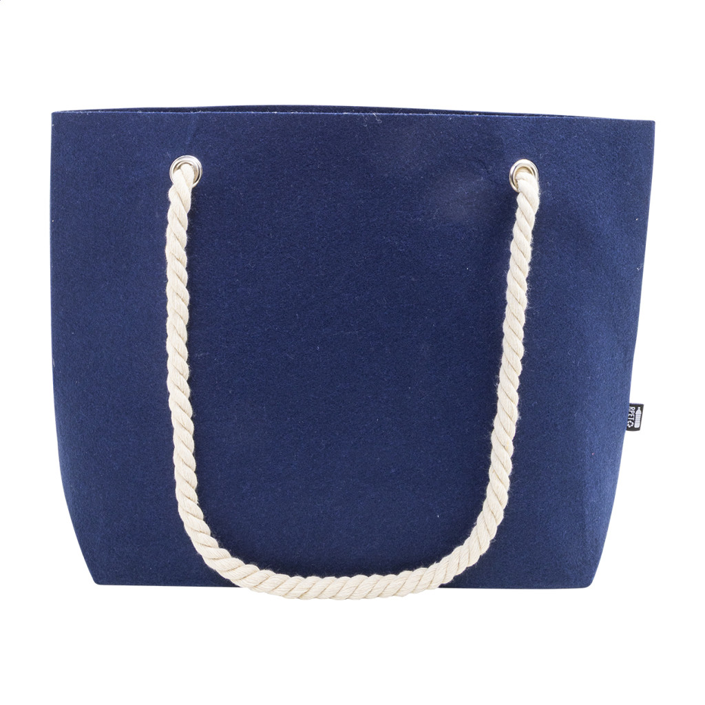 RPET filc strand- vagy bevásárlótáska pamut zsinóros fogantyúkkal és alsó betoldással. Megkülönböztető RPET címkével.
