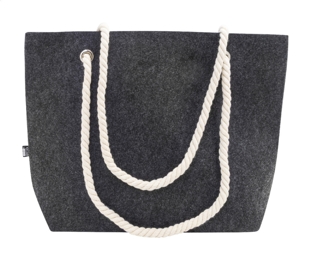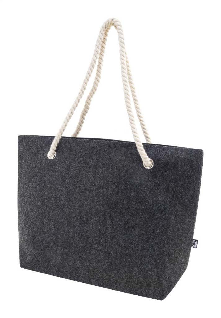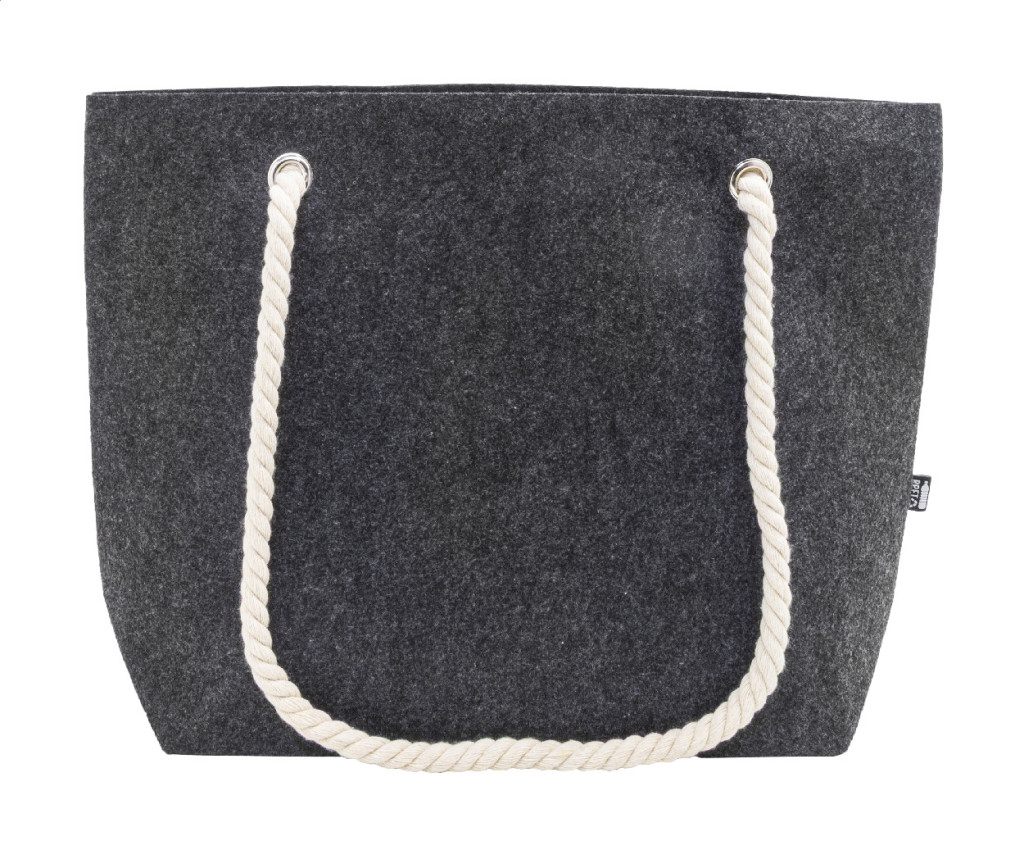RPET filc strand- vagy bevásárlótáska pamut zsinóros fogantyúkkal és alsó betoldással. Megkülönböztető RPET címkével.