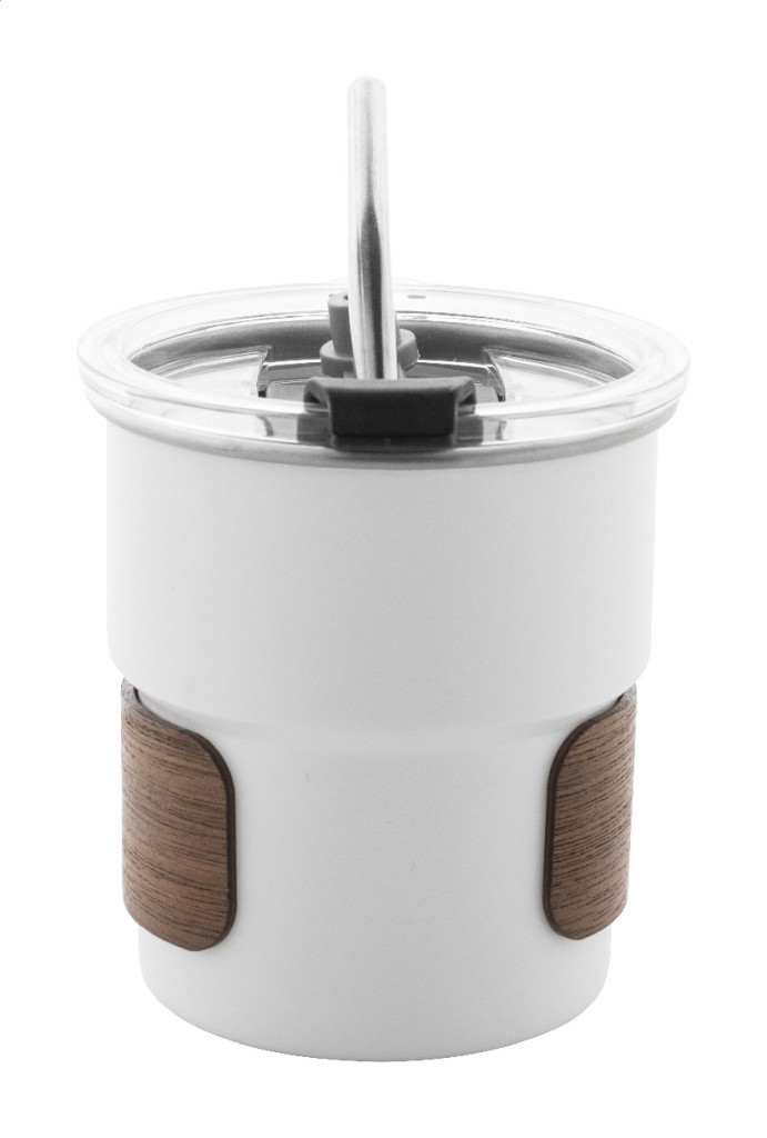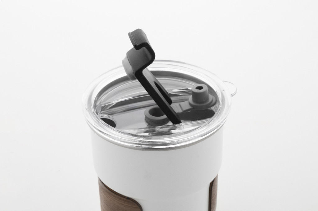 Egyfalú, újrahasznosított rozsdamentes acél utazópohár diófa markolattal, műanyag ivófedéllel és újrahasznosított rozsdamentes acél szívószállal. 260 ml.