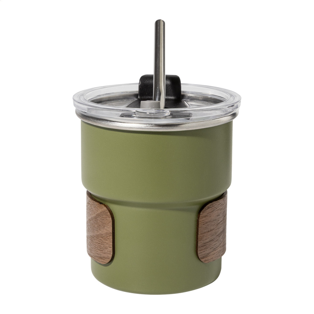 Egyfalú, újrahasznosított rozsdamentes acél utazópohár diófa markolattal, műanyag ivófedéllel és újrahasznosított rozsdamentes acél szívószállal. 260 ml.