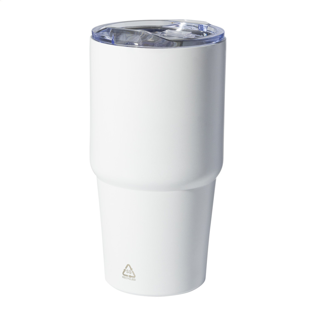 Duplafalú, újrahasznosított rozsdamentes acélból készült thermo pohár PS műanyag ivófedéllel. 600 ml.