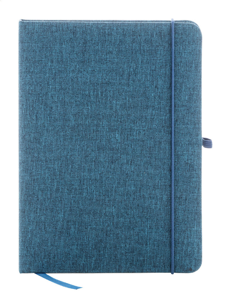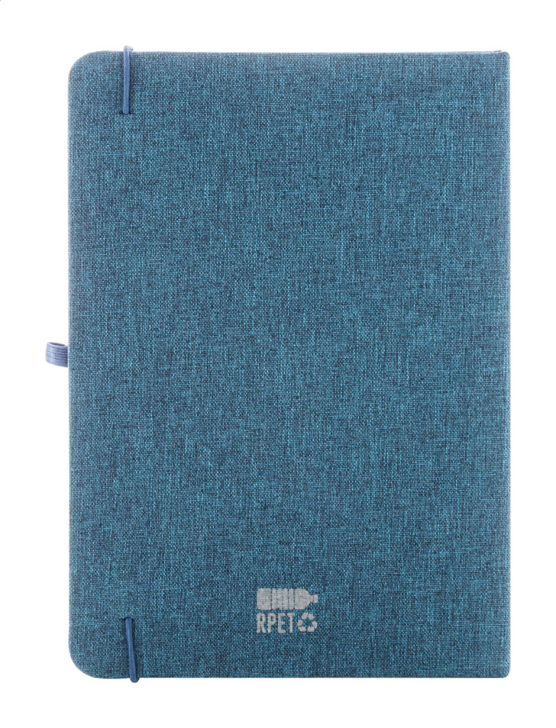 300D RPET poliészter borítású jegyzetfüzet 80 sima lappal. Hozzáillő színű gumipánttal, könyvjelzővel és tolltartóval. A5 méretű.
