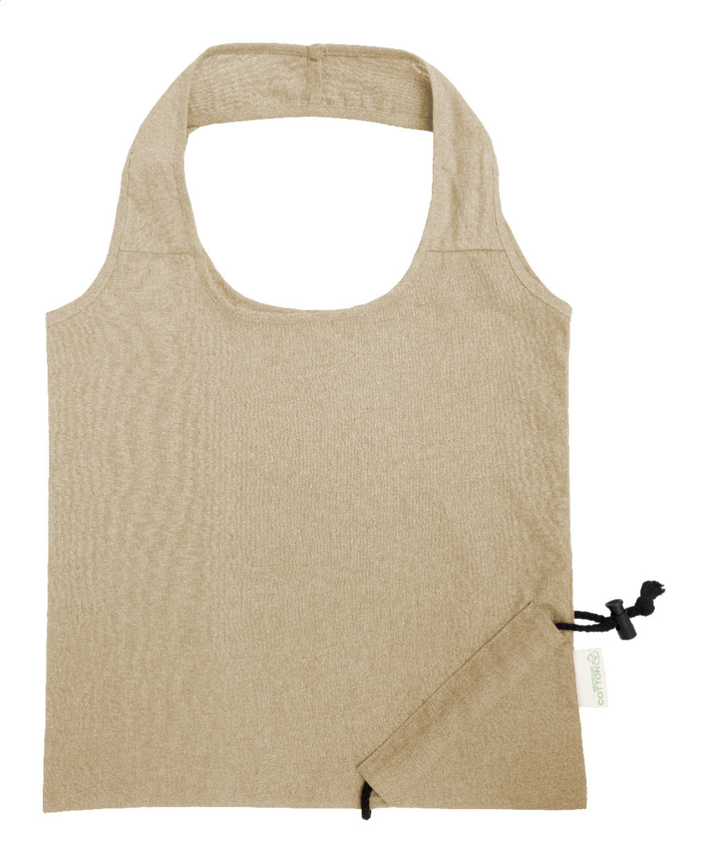 Összehajtható bevásárlótáska 70% újrahasznosított pamutból és 30% RPET poliészterből, 140 g/m². Megkülönböztető újrahasznosított pamut címkével.